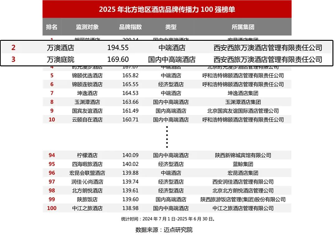 近日,西旅萬澳酒店旗下「萬澳酒店」&「萬澳庭院」憑借廣泛的品牌影響力和出色的創(chuàng)新傳播能力,躍居邁點(diǎn)研究院(MTA)“2025年北方地區(qū)酒店品牌傳播力100強(qiáng)榜單”前三甲。