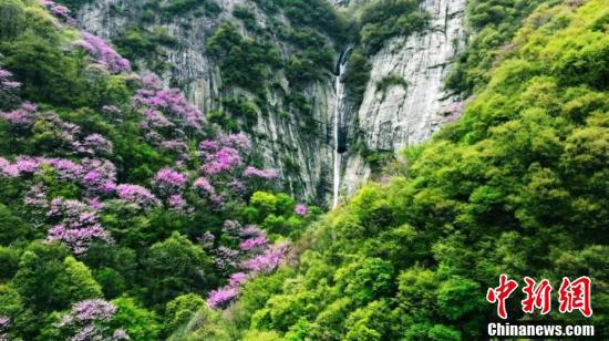 紫荊花與秦嶺山間飛瀑相映成趣。