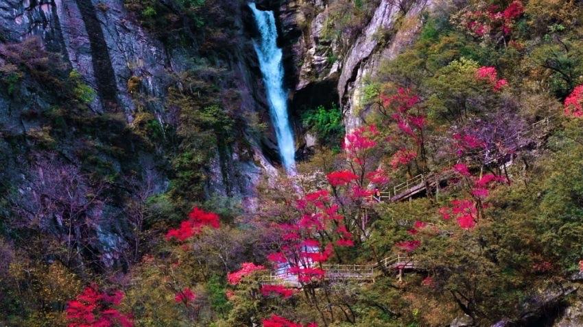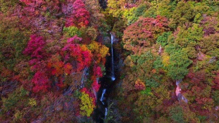 園內(nèi)有眾多瀑布,如彩虹瀑布、仙鶴橋瀑布等,瀑布飛瀉而下,激起層層水霧,在紅葉的映襯下更顯靈動。從空中俯瞰,瀑布猶如銀針貫穿于萬木之中,與周圍的山巒、樹木共同構(gòu)成了山水相依的自然景觀。
