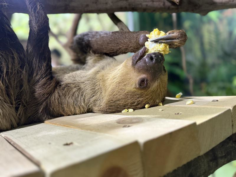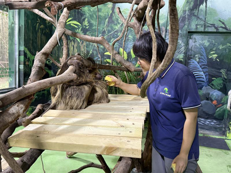 樹懶們倒掛在樹上,懶洋洋吃著玉米,發(fā)出脆脆的聲音,其中一只叫“忽忽”的樹懶是一個(gè)女孩。飼養(yǎng)員劉澤銳說,取這個(gè)名字是因?yàn)樗鈺r(shí)好時(shí)壞,平時(shí)比較愛生氣,然后人摸它的時(shí)候會發(fā)出呼呼的聲音嚇唬人?!暗墙o它喂食的時(shí)候就表現(xiàn)得很開心很積極,它吃得最好,胡蘿卜、黃瓜、南瓜、菜葉子等都不挑,活動(dòng)量也很大,比較淘氣一點(diǎn),到處探索,今天早上跑到花盆里面去了?!眲射J說。