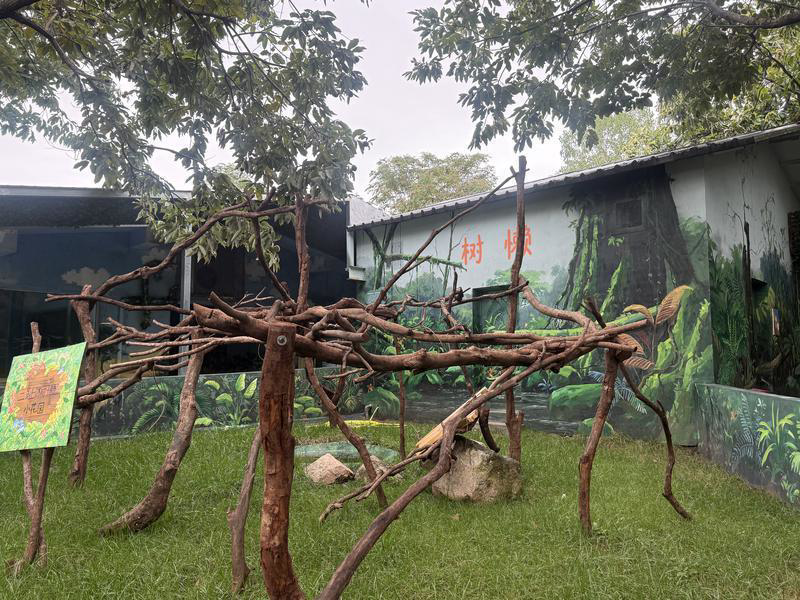 為迎接新成員的到來,園區(qū)為樹懶們新建了一處原生態(tài)的家園,設(shè)置樹屋并將仿真樹枝貫穿其中,供它們棲息。工作人員說,這樣的設(shè)計(jì)能滿足樹懶棲居樹上,愛用爪鉤住樹枝倒掛身軀或在樹上移行的特性。樹懶館門口,掛著一幅工作人員手繪的微笑樹懶漫畫,十分溫馨。樹屋里,隨處可見熱帶雨林的布置,對溫度、濕度有著嚴(yán)格的控制。