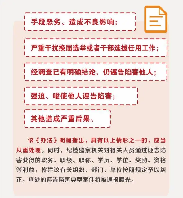 《辦法》指出,對于故意誣告陷害他人,致使他人受到不良政治影響、名譽損失或者責(zé)任追究的,一經(jīng)查實,將依規(guī)依紀依法追究誣告陷害人的責(zé)任。是中共黨員和監(jiān)察對象的,將視情給予相應(yīng)的黨紀政務(wù)處分;是其他人員的,按有關(guān)規(guī)定移送公安機關(guān)或其他有關(guān)部門依法處理。對于匿名誣告陷害他人的違紀違法行為,經(jīng)市紀委監(jiān)委主要負責(zé)人批準(zhǔn)后,可采取核查筆跡、網(wǎng)絡(luò)IP地址等方式追查相關(guān)人員身份。