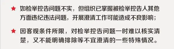 《辦法》也同時規(guī)定了一些不予澄清的情形。如檢舉控告問題不實,但組織已掌握被檢舉控告人其他方面違紀違法問題,開展澄清工作可能造成不良影響;因客觀條件所限,對檢舉控告問題一時難以核實清楚,又不能明確排除等不宜澄清的一些特殊情況。